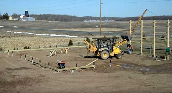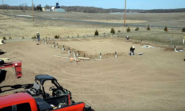 Свайний або монолітний фундамент для корівника встановлюють за допомогою спеціальної будівельної техніки. Кут палі з землею становить 90 градусів. Частини фундаменту зв'язуються між собою бетоном.