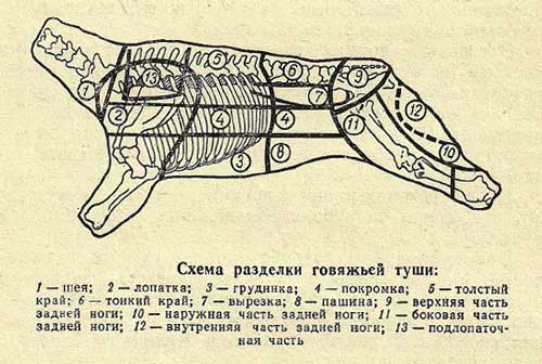 Грамотна обробка бика, розрубування тіла корови або теляти, справа досить клопітка. Але все ж при великому бажанні цю науку здолати можна. Ще з радянських часів практично на кожному м'ясному відділі висить малозрозуміла для більшості людей схема із зазначенням основних господарських частин яловичої туші. Скажемо чесно, обробити по ній тушу зможе тільки професіонал, а ми з вами зараз пройдемося по основним етапам такої обробки і розберемо, для яких цілей призначені ті чи інші частини туші.