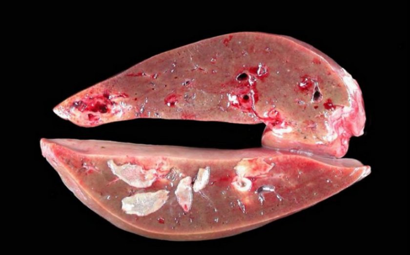 Фасциолез Корова виглядає пригнобленої, страждає від високої температури (до 41 градуса), погіршення апетиту, блювання. При обмацуванні можна виявити, що печінка збільшена, а черевні м'язи напружені.