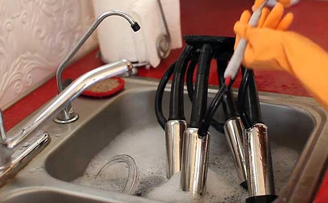 Апаратуру для доїння необхідно промивати після кожного доїння і містити в чистоті, для чого в комплекті до системи є спеціальні щітки для мийки.