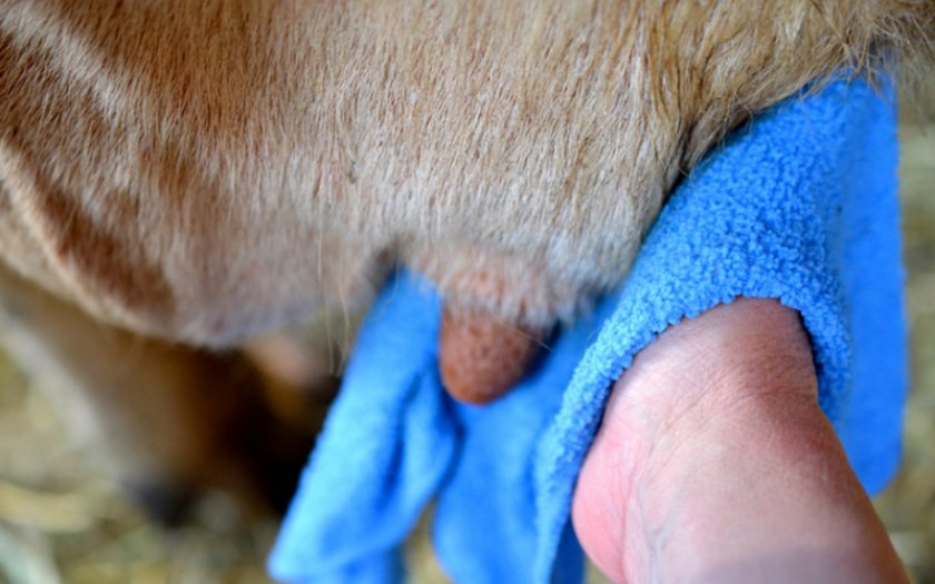 - Вим'я, вульву і навколишні їх ділянки шкіри обережно прополоскати дезинфікуючим засобом (можна використовувати фурацилін або слабкий розчин перманганату калію) і витерти насухо м'якою ганчіркою.