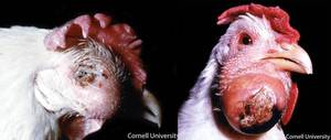 Це захворювання забирає життя курчат на 2-3 місяці. Але найбільше гине від неї дорослої птиці. Симптоми хвороби: млявість, жар, спрага, курка практично не рухається, а з носових отворів випливає слизова рідина, пронос, курка постійно наїжачує і піднімає пір'я. Гребінець і сережки у такий курки потемніють і набудуть синюватий відтінок. Якщо не лікувати відразу цю інфекцію, то смертність всього поголів'я гарантована.
