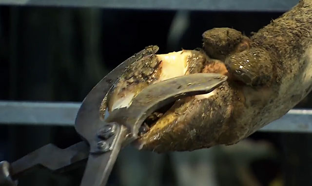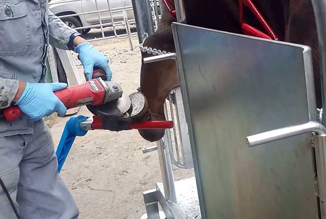 Щільно закріплені кінцівки корови попередньо розчищають від бруду, і тільки потім оператор проводить зрізання старої роговий поверхні до появи тканини білого кольору.