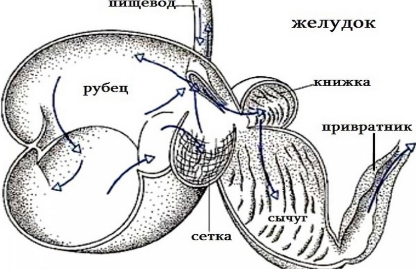 Травлення корови – складний багатоетапний процес. Так як зуби не пережовують їжу, а тільки зрізають, бродіння відбувається в шлунку.