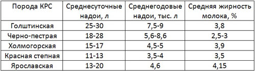 Первістки дає до 10 л в день, а надої у більш дорослих особин можуть досягати 25-40 л. Молочна продуктивність корів залежить від породи великої рогатої худоби, які в залежності від цілей змісту поділяються на: молочні, м'ясні, м'ясо-молочні.